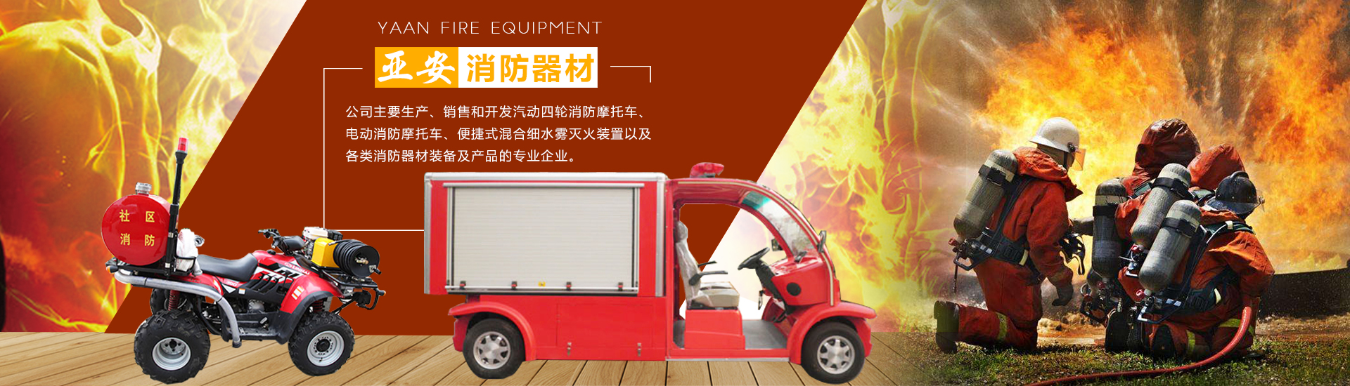 公司主要生產、銷售和開發汽動四輪消防摩托車、電動消防摩托車、便捷式混合細水霧滅火裝置